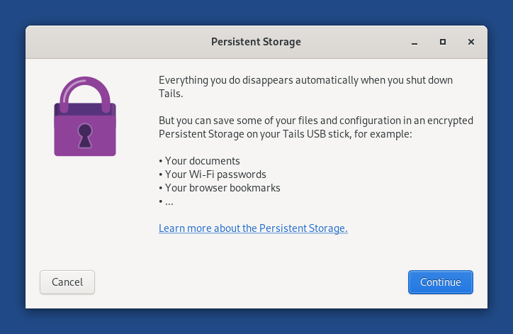Caso você receba a mensagem de erro Desculpe, não foi possível criar um Armazenamento Persistente neste dispositivo, será necessário seguir as instruções em instalando Tails em um pendrive USB.