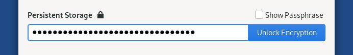 Wenn Sie Tails starten, geben Sie im Abschnitt Persistenter Speicher des Willkommensbildschirm Ihre Passphrase ein und klicken Sie auf Verschlüsselung entsperren.