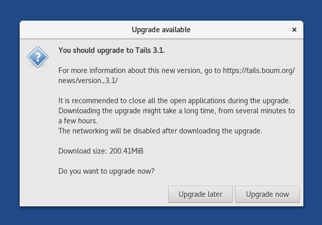 If you cannot upgrade at startup, you can open Tails Upgrader later by choosing Apps ▸ Tails ▸ About Tails and clicking Check for Upgrades.